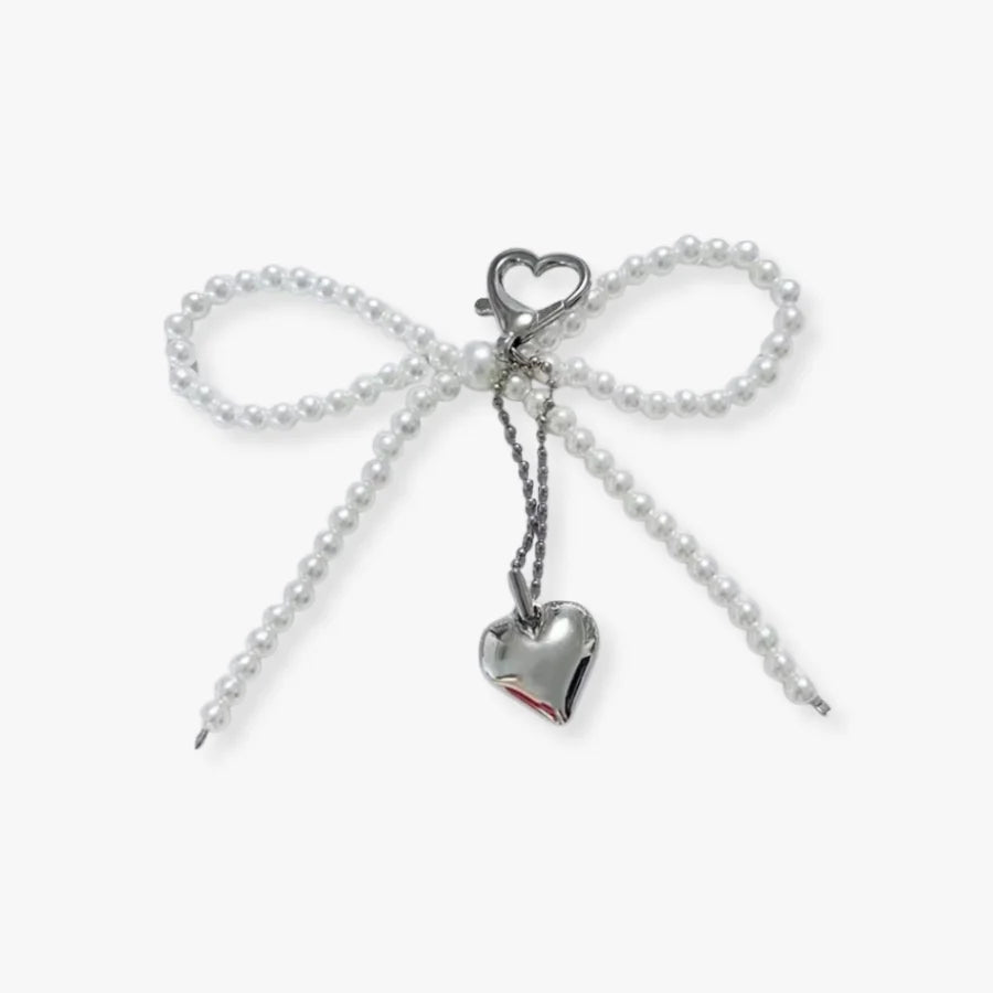 Eine zarte Schleife mit einem verträumten Touch:Unser Taschenanhänger mit Perlenschleife vereint Eleganz und Charme in einem süßen Stück. Er besteht aus glänzenden Kunstperlen, die zu einer perfekten Schleife geformt sind, und ist mit einem baumelnden Silberherz und einer herzförmigen Schließe versehen. Ob an Ihrer Tasche befestigt oder an einem Reißverschluss, sie setzt einen romantischen, Vintage-inspirierten Akzent, der ebenso zeitlos wie bezaubernd ist.